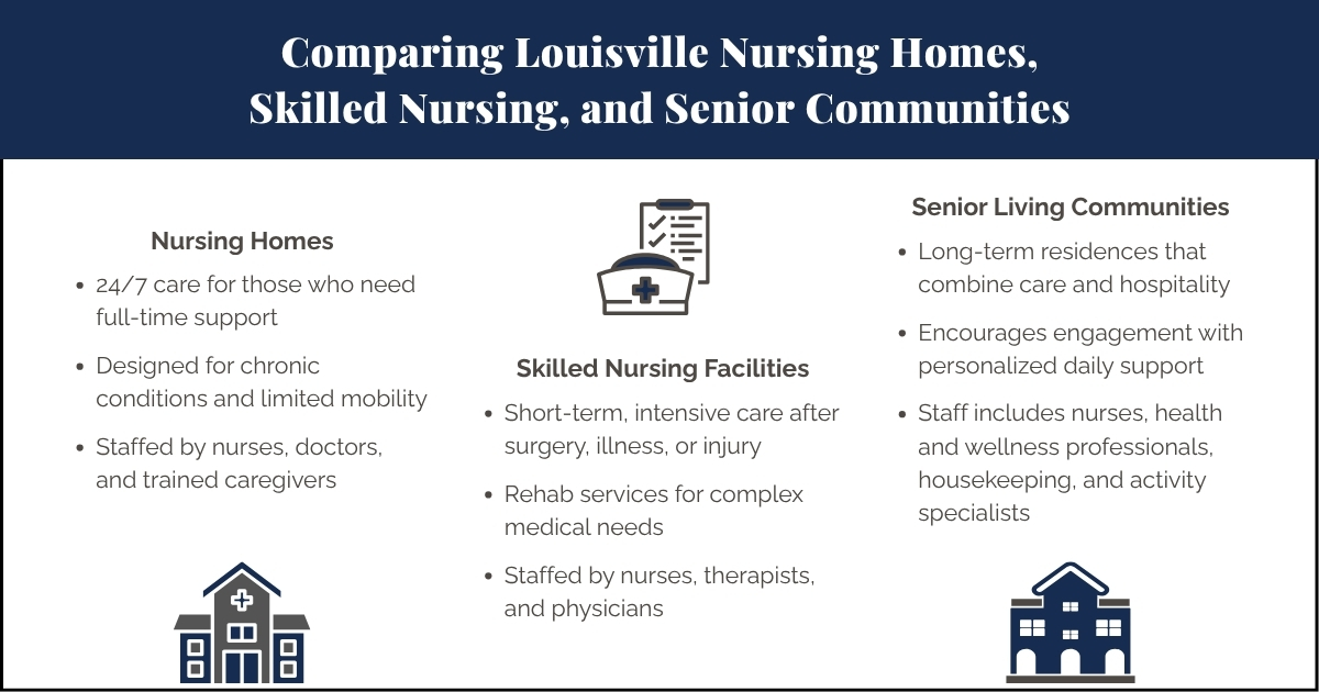 The primary distinction lies in the medical complexity of care provided. Skilled nursing facilities in Louisville handle wound care, IV therapy, ventilator management, and other specialized medical procedures that require professional oversight. Residents often stay temporarily while recovering from hospital stays, though some remain permanently due to ongoing medical requirements.